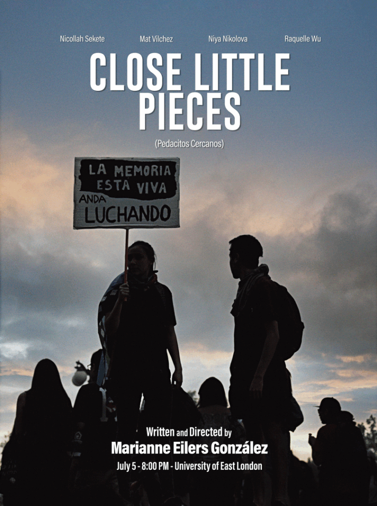 Close Little Pieces is a narrative and fragmented exploration of what Chile is from both an internal and external perspective. Through a Happening, this piece will examine the cultural identity of the country, putting the spectator in the centre. As theatre can work as a tool to approach, from an active angle, to what happens and feels like to be in a different place in the world, this performance intends to transport the spectator to another place, time, and culture. Through the universal language of emotion, it will make them feel what being Latin-American and Chilean is like and will ask them to encounter the different social issues the country faces.